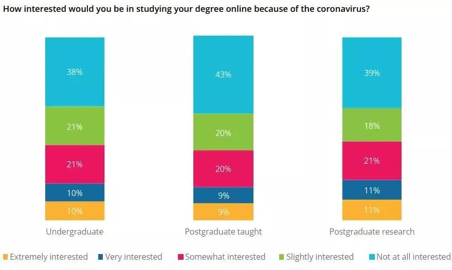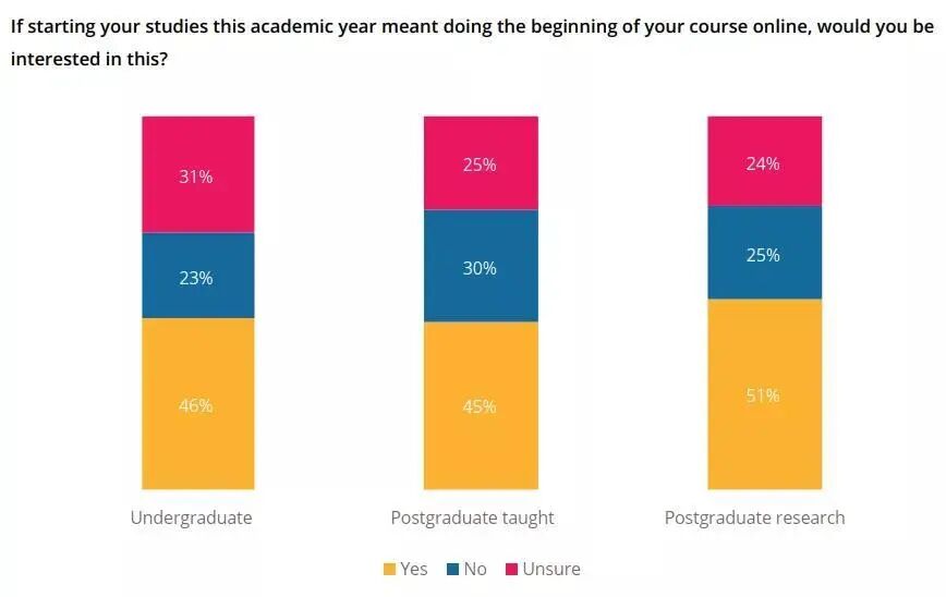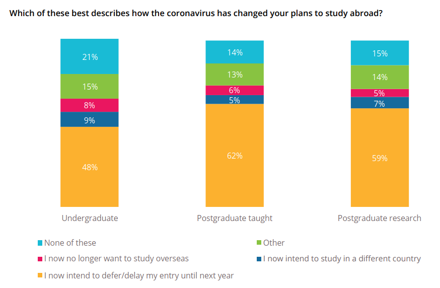相對而言,研究生課程較短,在線課程也可作為彌補措施。此外,本科生或準本科生的選擇余地很少,再加上全球流動限制和就業(yè)市場緊縮等因素,本科生變更留學計劃的意愿相對較低。