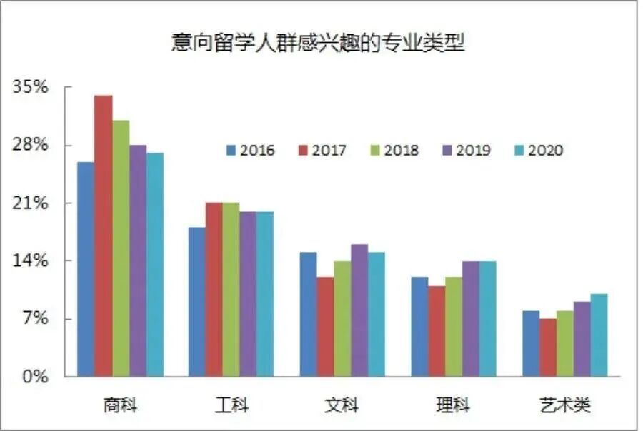 同時,英國研究生階段受歡迎,美國本科及以下階段受歡迎。數(shù)據(jù)還顯示,商科仍舊是最熱門的意向留學專業(yè),但其熱度從2017年的34%占比下降到了今年的27%,呈現(xiàn)出連年下降趨勢,理科、藝術(shù)類專業(yè)的熱度則開始上升。