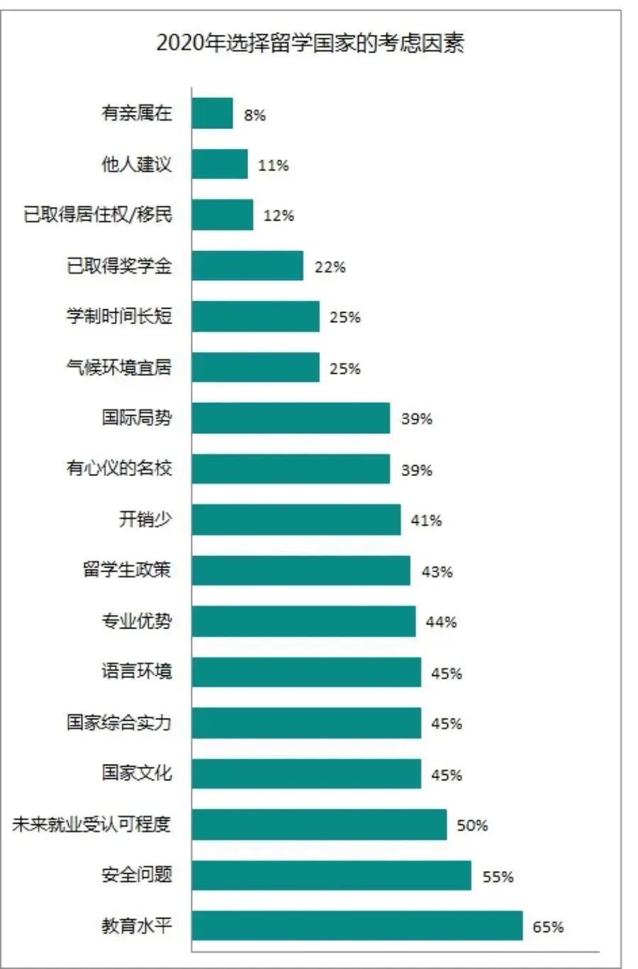 意向留學人群在選擇留學國家的考慮因素中,“教育水平”均排在首位。排在前三位的考慮因素有教育水平、安全問題、未來就業(yè)認可程度,對比往年意向人群的重視程度均有所升高;對比去年對國際局勢的關(guān)注度也略有提升。