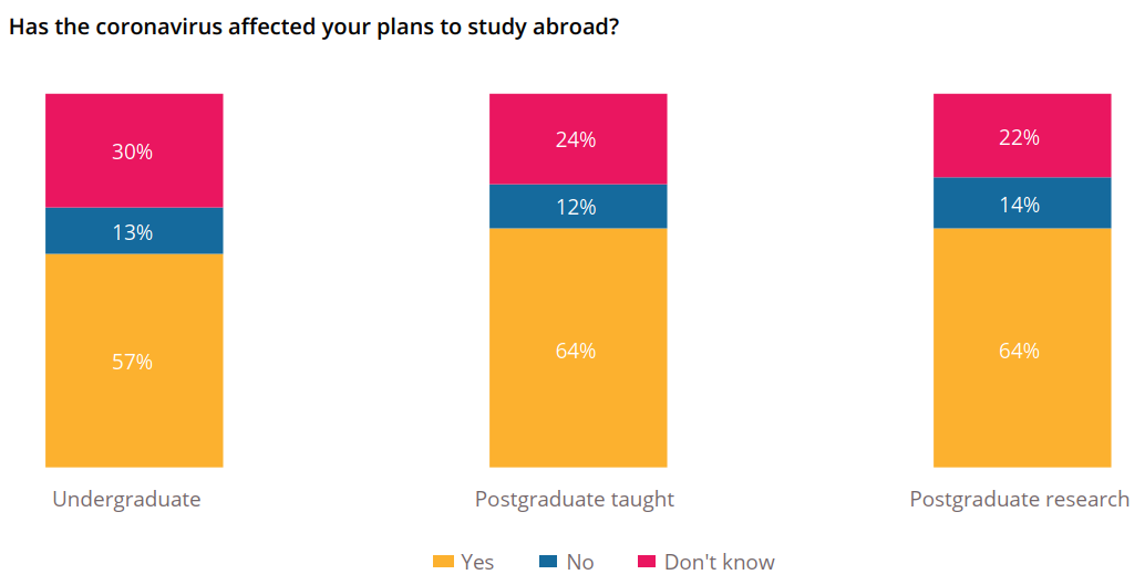 冠狀病毒危機迫使準留學生迅速改變他們的求學計劃,隨著全球疫情的發(fā)展,應(yīng)對措施也在發(fā)生著變化。在不同層次的準留學生之間,本科生的求學計劃受疫情影響最小,相對來說,本科生也最不希望推遲以后的學業(yè),碩士生受影響最大,64%的碩士生稱留學計劃收到影響。